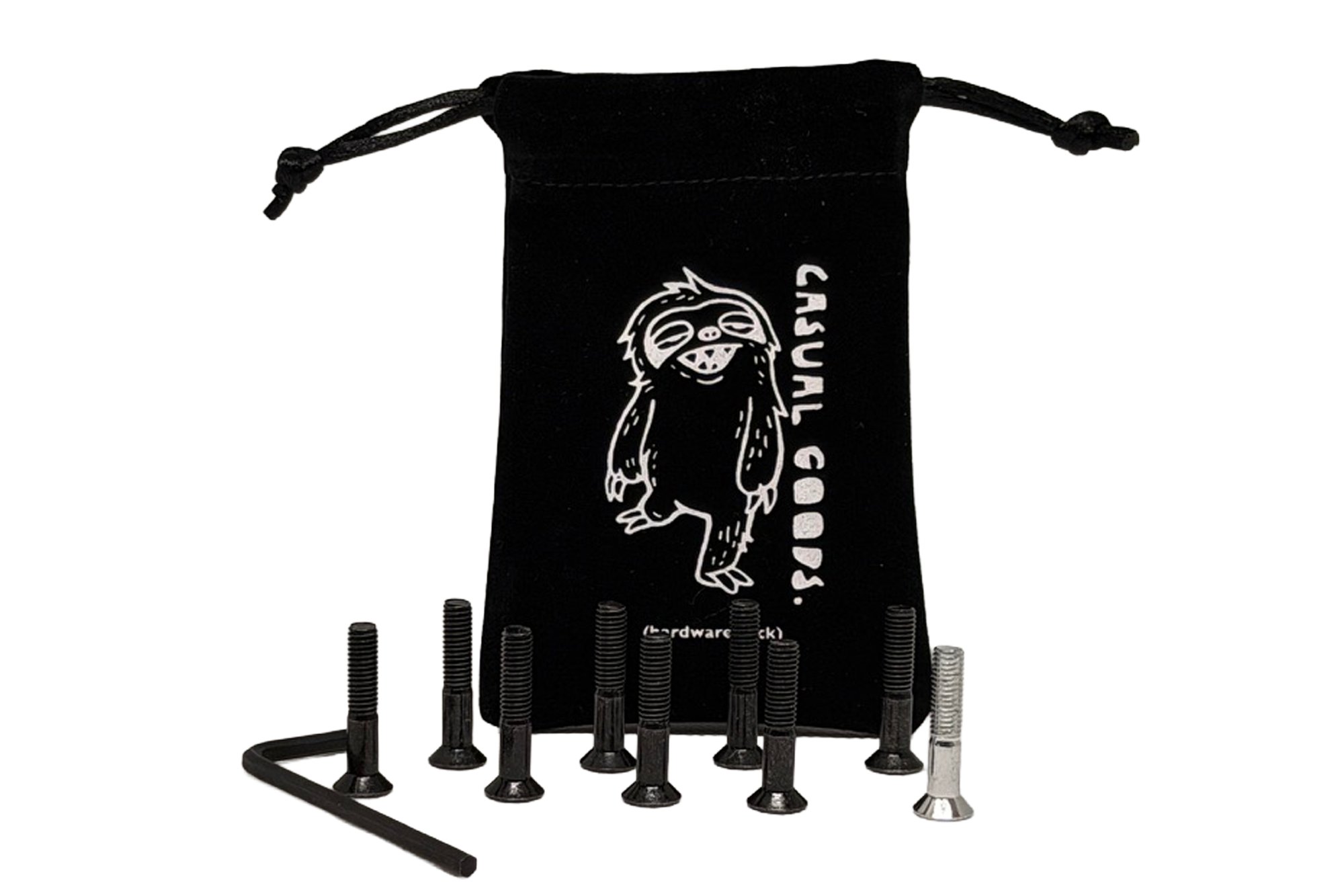 Packed in a reusable pouch, because loose hardware in your pockets is a bad idea.